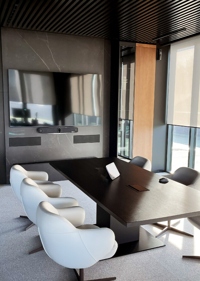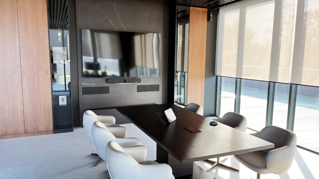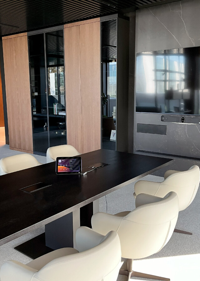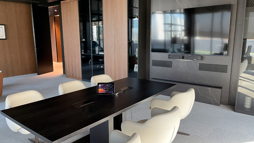 System HP Poly w połączeniu z 86" monitorem i centralnym sterowaniem jest intuicyjnym i niezawodnym narzędziem do spotkań multimedialnym.