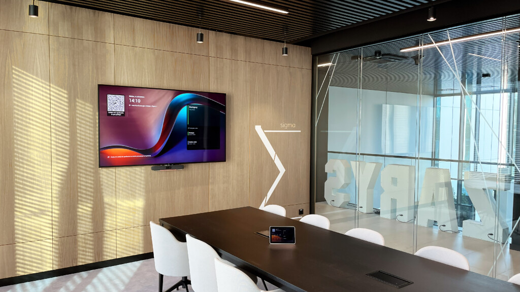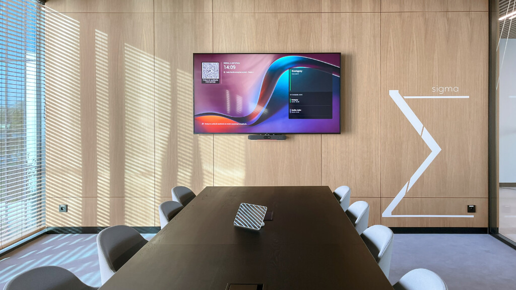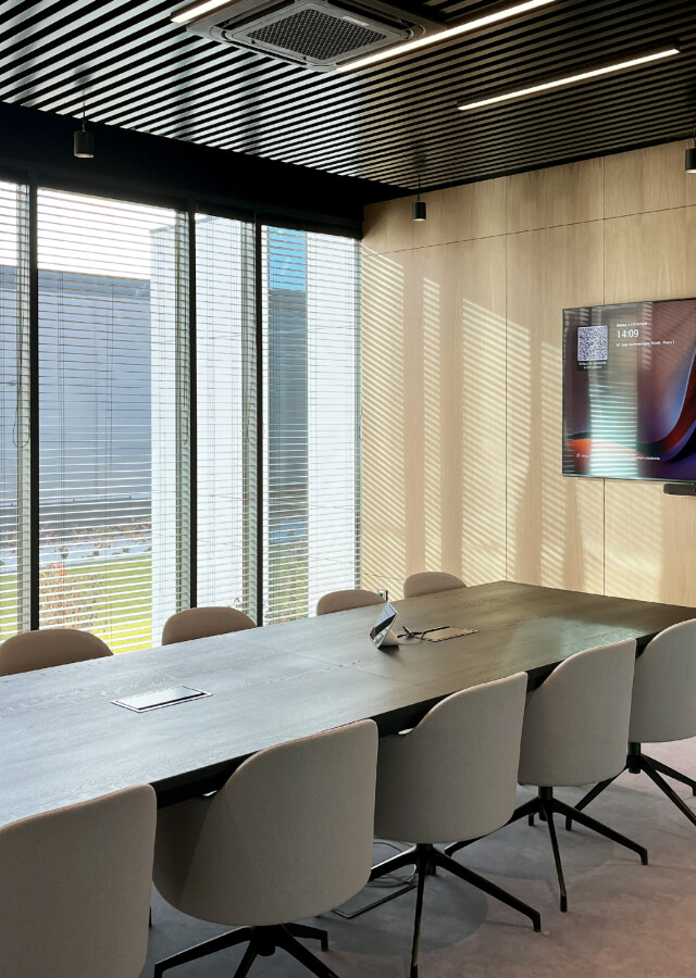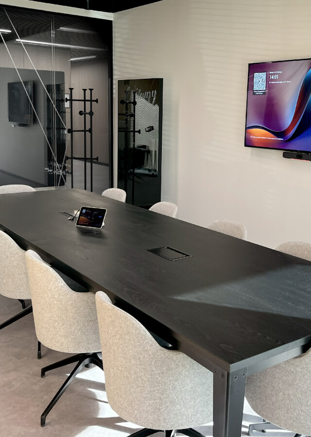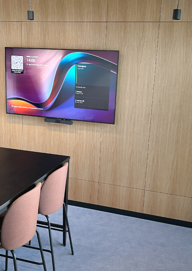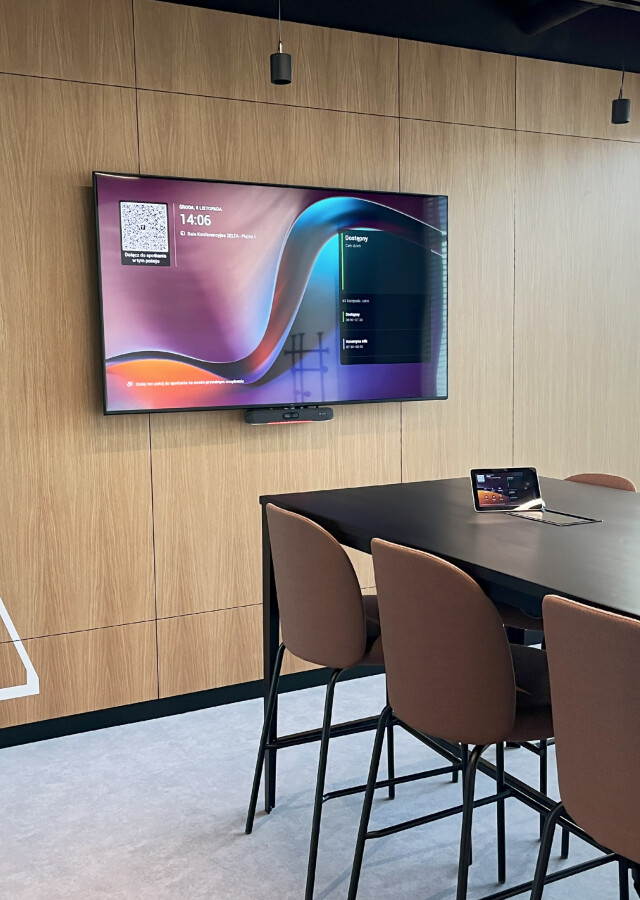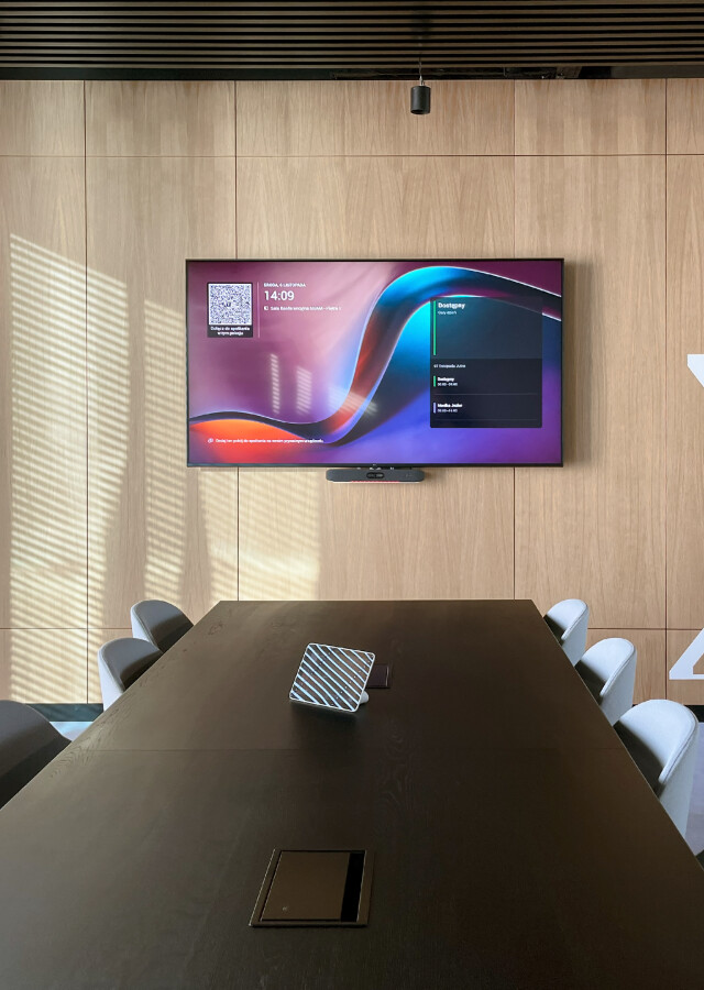 Wyposażyliśmy 4 sale konferencyjne w kompletne systemy do videokonferencji. W każdej ze stylowych sal można korzystać z systemu HP (Poly) współpracującego z Teams Rooms. Konfiguracja sal umożliwia również korzystanie z innych systemów konferencyjnych przez połączenie USB. Sale są zintegrowane z systemem rezerwacji sal; planowane spotkania wyświetlają się na ekranach rezerwacji przed każdą z nich oraz na samych panelach videokonferencyjnych. Rozwiązanie jest niezwykle intuicyjne, dotknięcie ekranu sterującego uruchamia konferencję, włącza monitor i wyświetla przed salą informację o zajętości. Zakończenie spotkania również jest automatyczne, po wylogowaniu się z Teams system po kilku minutach wyłączy się sam.