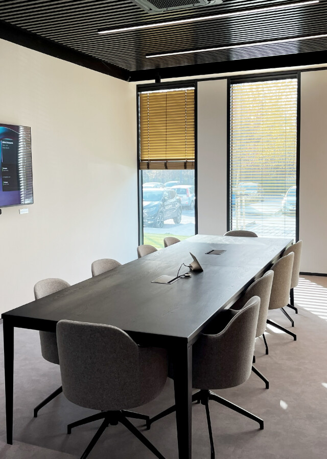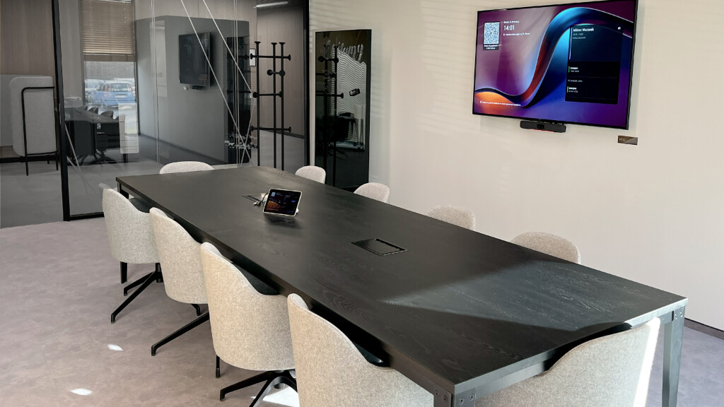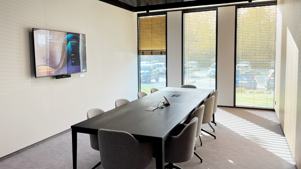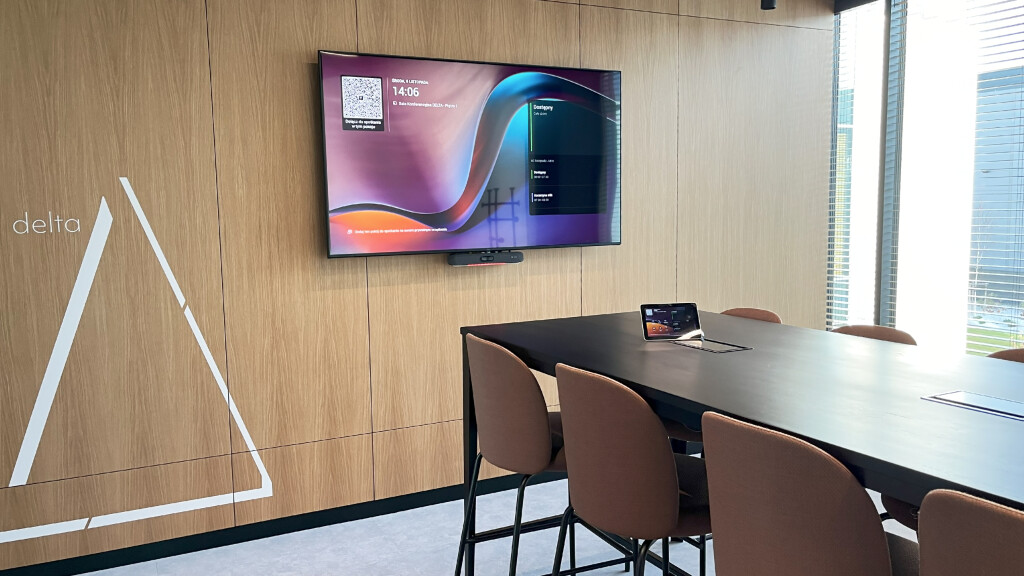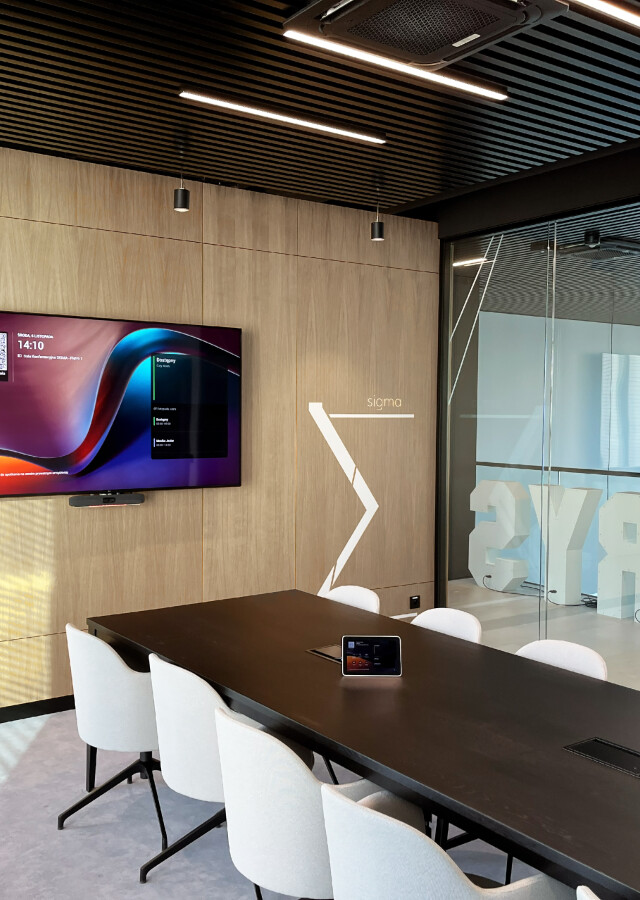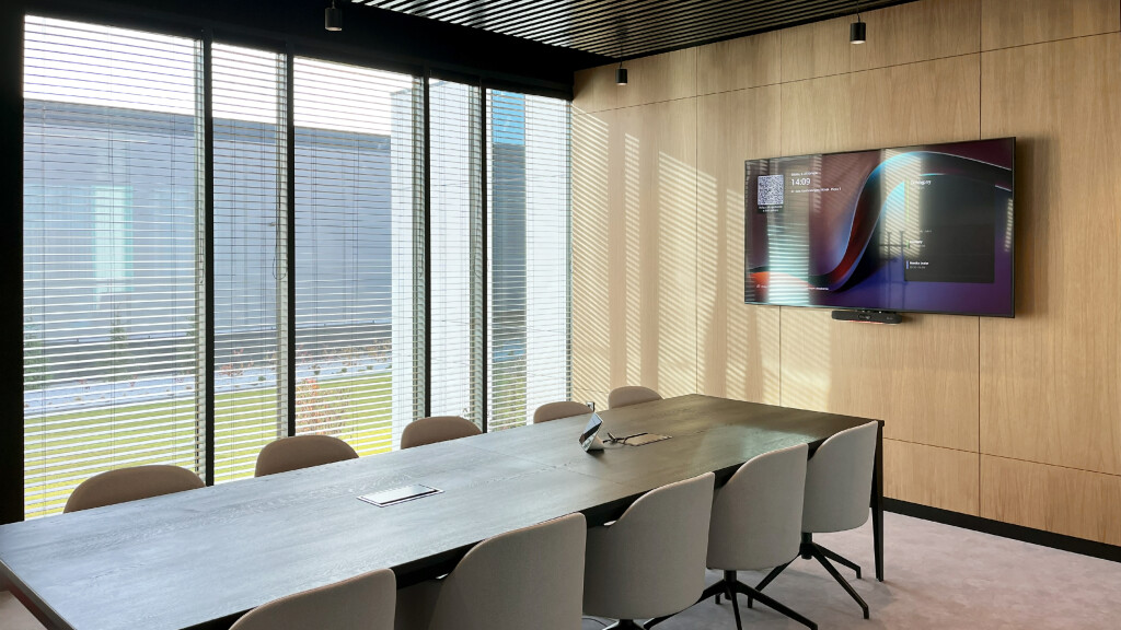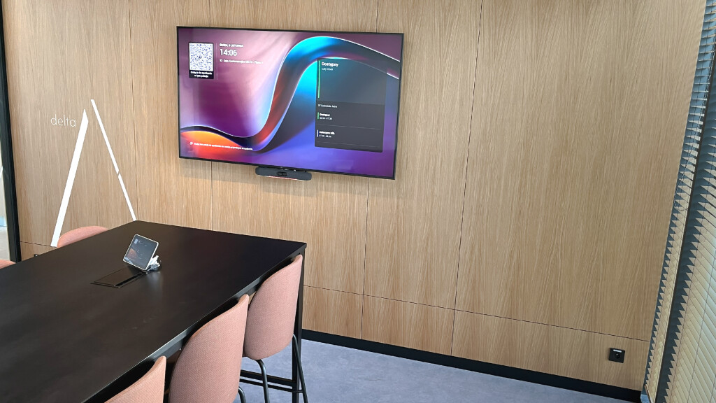 Wyposażyliśmy 4 sale konferencyjne w kompletne systemy do videokonferencji. W każdej ze stylowych sal można korzystać z systemu HP (Poly) współpracującego z Teams Rooms. Konfiguracja sal umożliwia również korzystanie z innych systemów konferencyjnych przez połączenie USB. Sale są zintegrowane z systemem rezerwacji sal; planowane spotkania wyświetlają się na ekranach rezerwacji przed każdą z nich oraz na samych panelach videokonferencyjnych. Rozwiązanie jest niezwykle intuicyjne, dotknięcie ekranu sterującego uruchamia konferencję, włącza monitor i wyświetla przed salą informację o zajętości. Zakończenie spotkania również jest automatyczne, po wylogowaniu się z Teams system po kilku minutach wyłączy się sam.